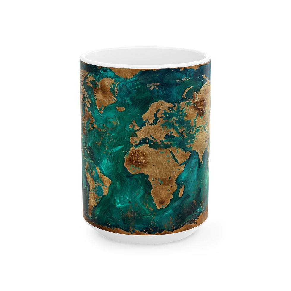 Global Elegance: Gold Green Blue World Map Coffee Mug -, (11oz, 15oz)